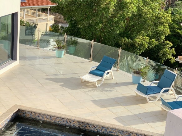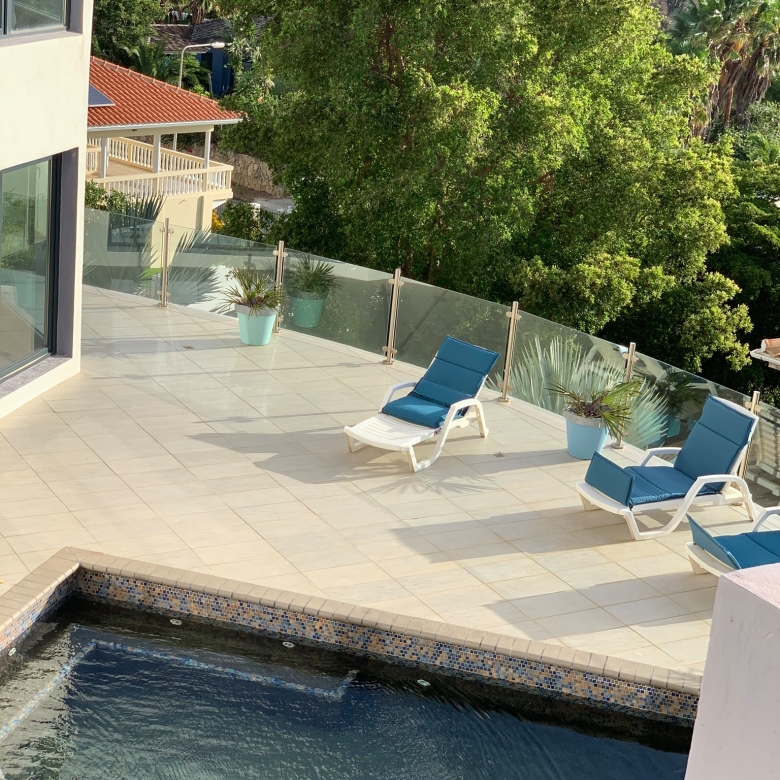 The pool deck (75m²) with private pool, only accessible via the living area; (with beautiful sunrise view)