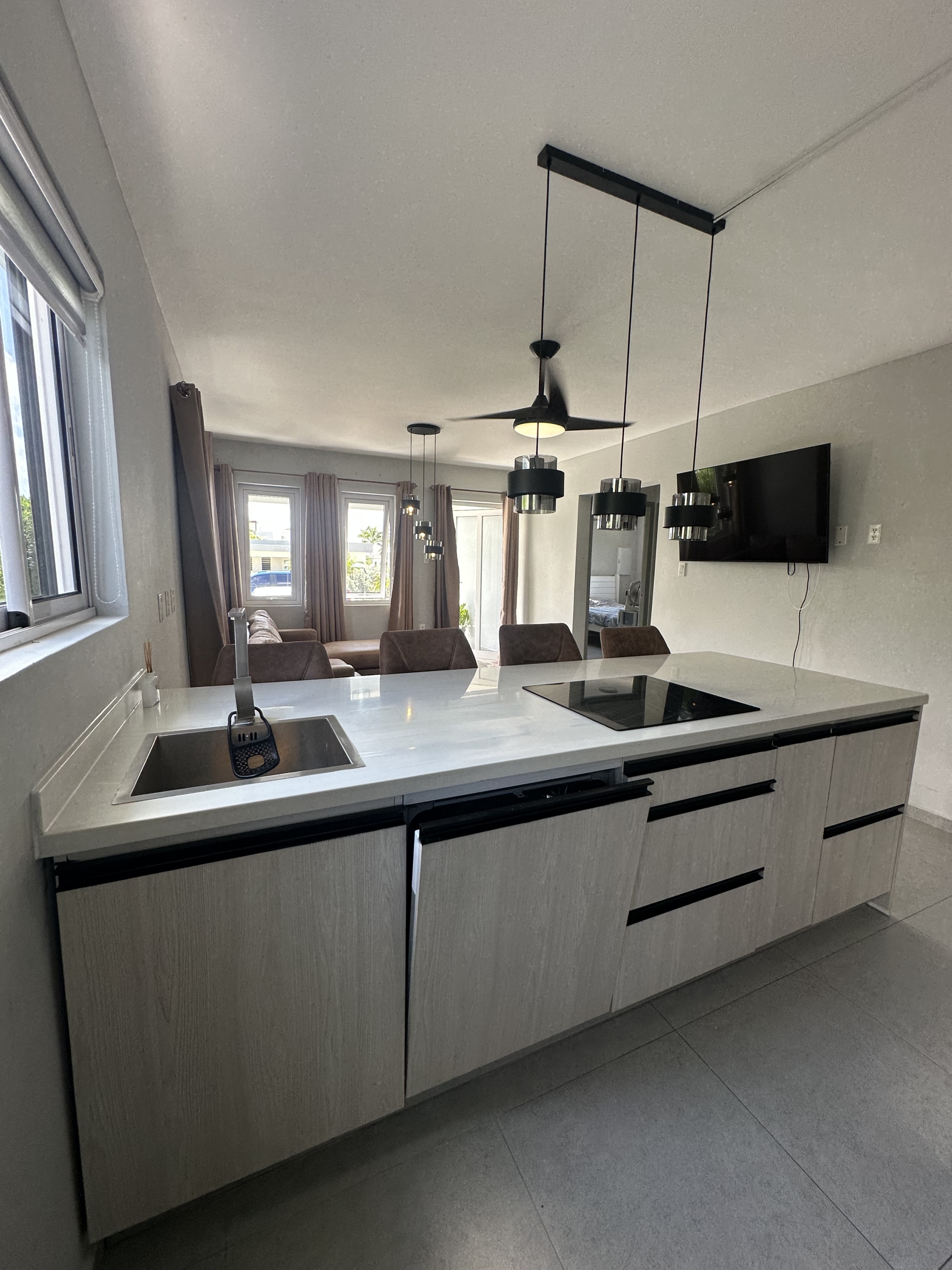 - Open living room connected to the open kitchen with island
